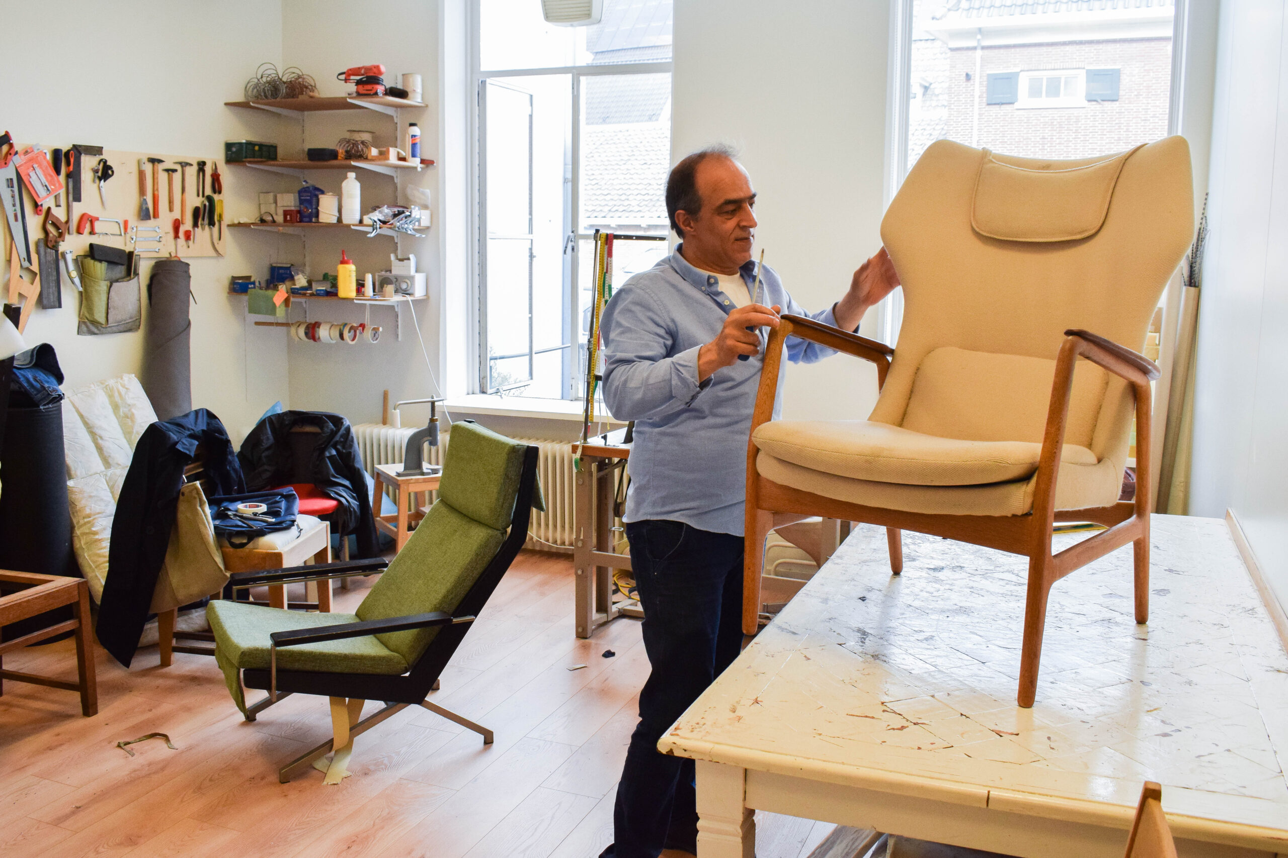 Heb je iets te stofferen, bel mij dan niet! Waarom? Bel eerst Ahmad Meubelstoffeerder in IJmuiden. Ahmad is naast school (Hout en Meubel College Amsterdam) mijn grote leermeester. Ik heb bij hem een jaar stage mogen lopen, met veel plezier. Wat deze man met zijn ogen ziet, kunnen zijn handen maken. Hij gaat voor elke klant een stapje verder. Hij wil gewoon dat het goed en mooi wordt. Het vakmanschap zit deze stoffeerder zo in zijn genen dat hij niet anders kan. Al meer dan 40 jaar zet hij zich in voor dit mooie vak. En wij hebben het geluk dat we daarvan kunnen genieten. Maar achter dat geluk zit verborgen leed. Ahmad is nl gevlucht vanuit Aleppo. Een verhaal zoals we bijna dagelijks in de krant lezen. Waarschijnlijk kan hij nooit meer terug. Ooit had hij daar een florerende, grote stoffeerderij met veel personeel. Nu is hij een geïntegreerde statushouder met Nederlands paspoort. Hij heeft zogezegd geluk gehad. Maar soms zie ik het verdriet in zijn ogen voor alles wat hij achter heeft gelaten. En de frustratie van wat hij hier niet begrijpt. Ik hoop zo dat hij ook hier het geluk weer gaat vinden. Dat gun ik hem.